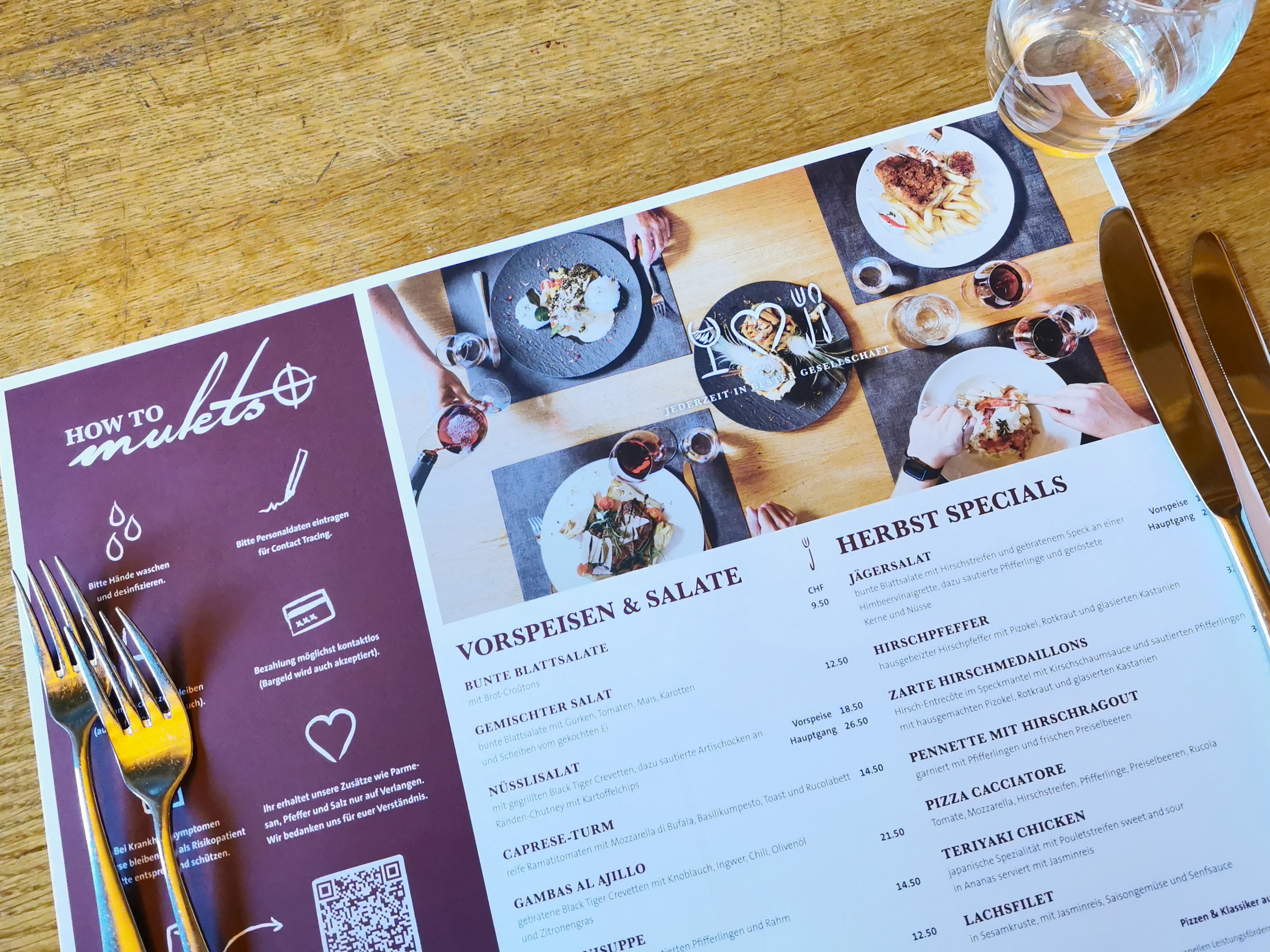 Heute sind die Gaunerzinken hautnah zu erleben. Sei es im Logo als Zeichen für «Hier gibt es gutes Essen» oder an den Wänden im Restorant in Silvaplana. In der Speisekarte können die Bedeutungen nachgelesen werden und für Kampagnen oder Sportkleidung adaptieren wir die Gaunerzinken im gleichen Stil weiter.