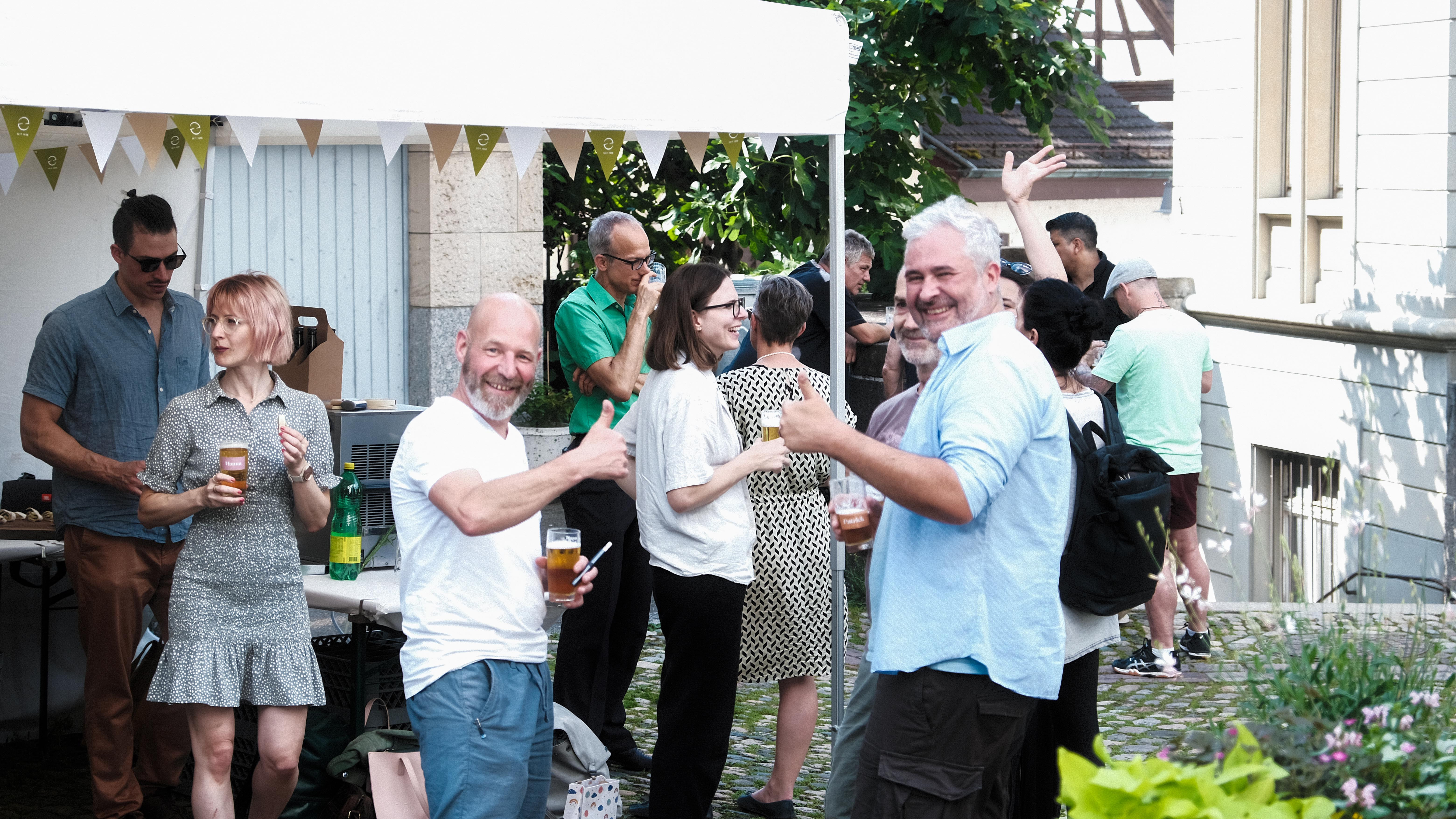 Team diffrent begrüsst die rund 70 Besucher:innen. Roger und Patrick sind happy mit der Einweihung des neuen Büros im Rahmen des Special Bn4 im